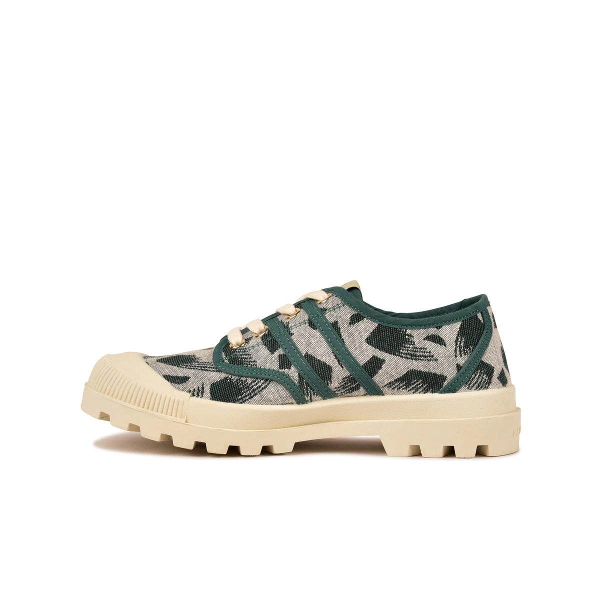 Cette saison, l’Authentique Pataugas version basse se pare de motifs camouflages vert émeraude WALKIE TALKIE. Ce textile tissé en France avec des fils recyclés apporte un savoir-faire artisanal à cette chaussure femme. Sa semelle crantée légendaire est très souple et ultra-flexible. Cette chaussure en toile se déclinera parfaitement avec votre dressing estival.