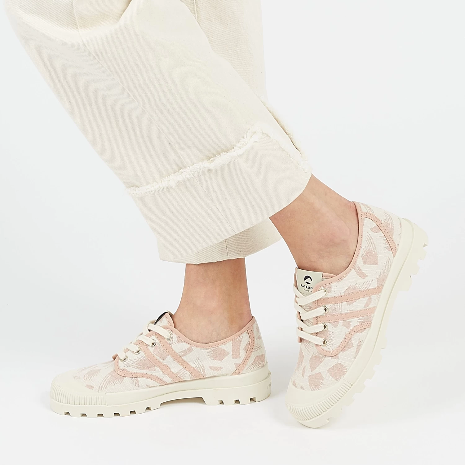 Cette saison, l’Authentique basse en toile s’habille de motifs camouflages déclinés en rose poudré. Le tissu jacquard vient de l’atelier de design Walkie-Talkie et est conçue en France. C’est ensuite en Espagne que la chaussure est assemblée et montée sur une semelle crantée légère et très souple.