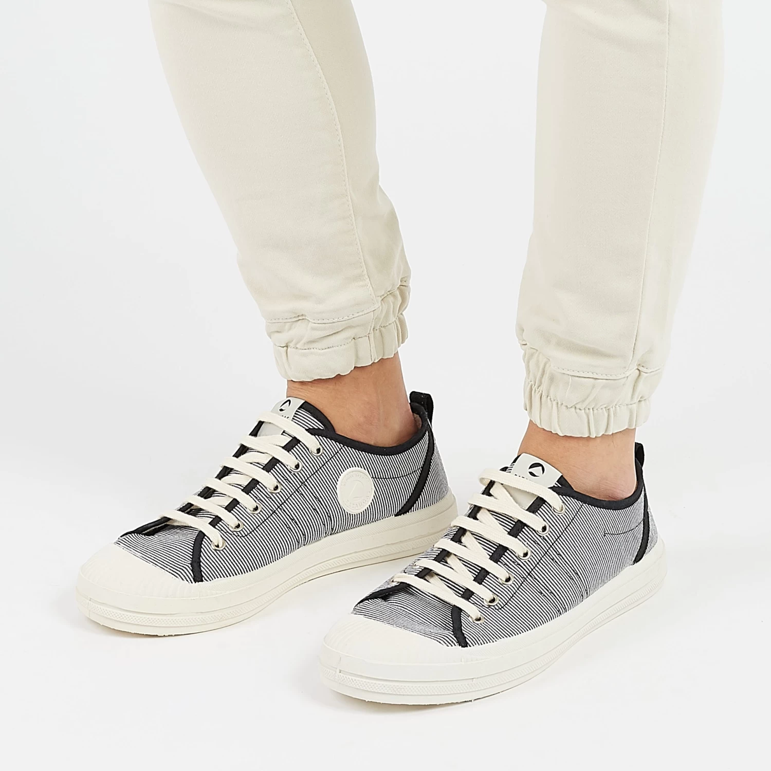 Craquez pour la basket homme ETCHE, la chaussure en toile légère et très confortable. Sa tige est composée d’un tissu en toile rayé blanc et noir et montée sur une semelle injectée en caoutchouc naturel. Ce procédé permet à la semelle de conférer plus de confort et de légèreté dans votre marche. Sa semelle intérieure est anatomique et s’enlève très facilement afin d’y placer vos propres semelles si vous le souhaitez.